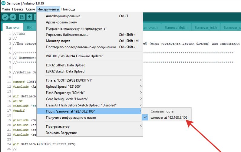 Перезагрузить Самовар и перезапустить Arduino IDE. После этого в сетевых портах Arduino IDE появится IP адрес Самовара.